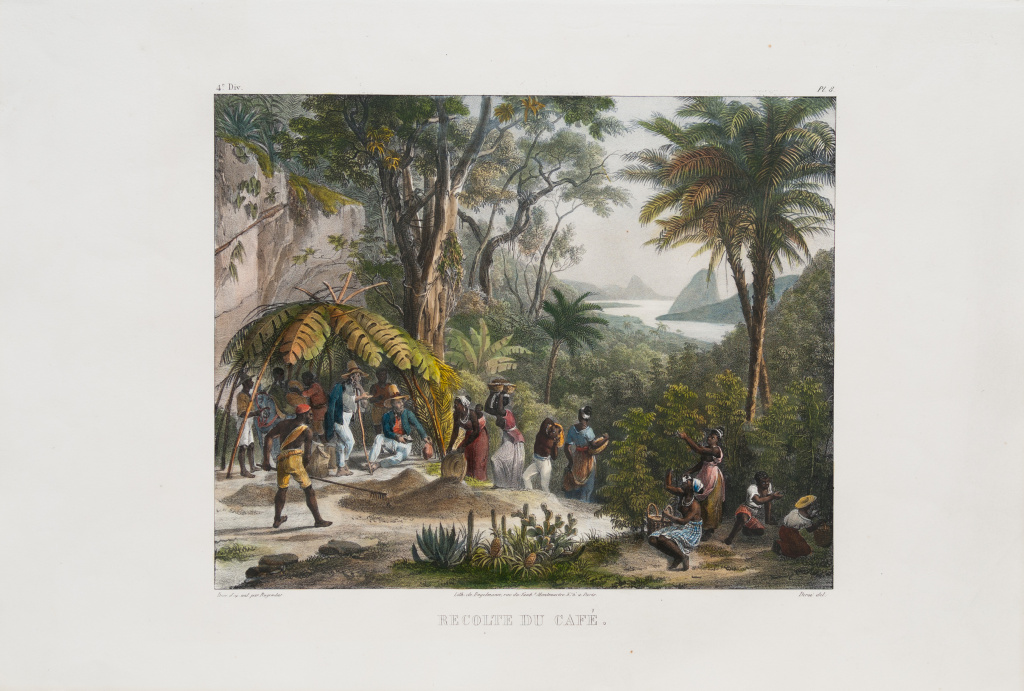 O artista alemão Johann Moritz Rugendas (1802-1858) registrou, na gravura (abaixo) publicada na França em 1835, trabalhadores escravizados colhendo café enquanto seus senhores descansam sob uma tenda.